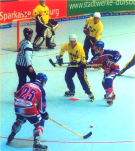 一般都在運動場內比賽。由兩隊進行對戰,一隊各6人。只能『推』動球滾動,不能打擊球使球離開地板。不同於直排輪曲棍球,選手只著運動鞋,單純以跑動方式進行。