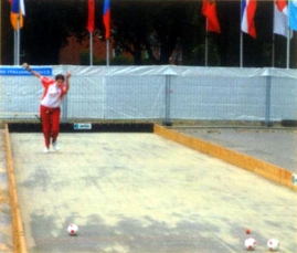 又名地擲球,比賽時參賽者各投擲一個直徑約25-35毫米的小白球,接著輪流以投擲或拋擊的方式擲出大球,擲出時雙腳必須在圓圈內完成動作,大球越接近小球者得分,當雙方都沒有大球時,結果便可以算出。以雙方靠近小白球的多少計分,1球1分。最先達到13分的隊伍獲勝。
