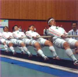 拔河是以兩隊之間較勁合作力量的競技,而拔河比賽的分界是根據兩隊各八位參賽者的總體重來區分,以確保比賽的公平性,只要隊伍把繩子的中心往後拉四公尺就是獲勝。