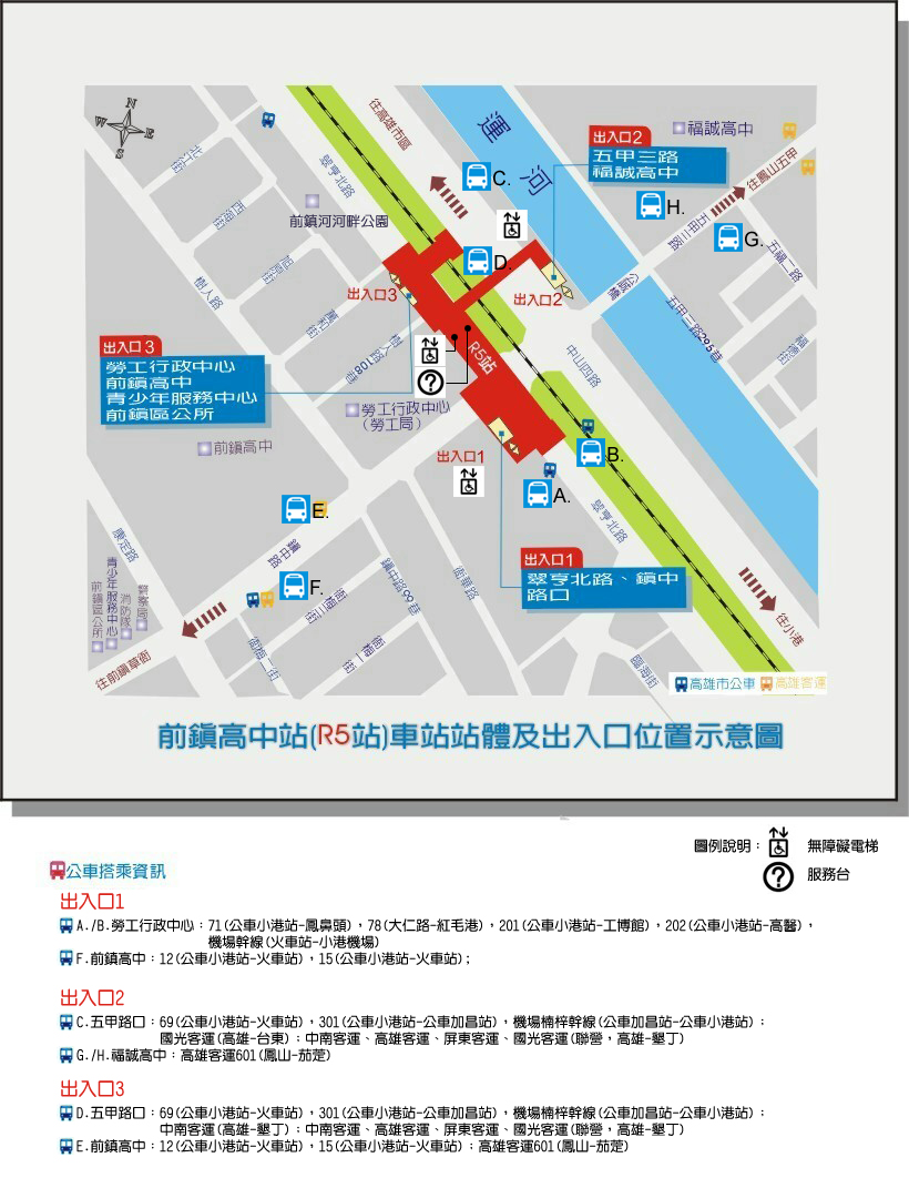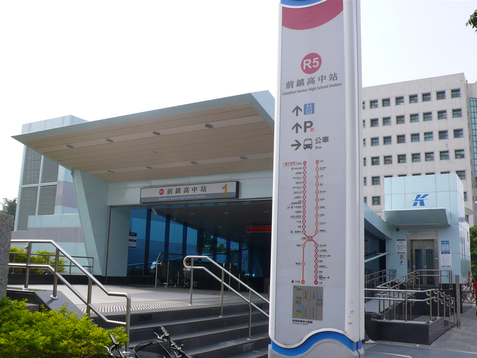 前鎮高中站位於中山四路、五甲三路、鎮中路口,分別有三個出入口。高雄市勞工行政中心、前鎮區行政中心、前鎮高中、福誠高中等都在本站範圍內,串連前鎮草衙和高雄縣五甲市鎮。前鎮河整治美化之後,也是休憩的好去處,媲美愛河。