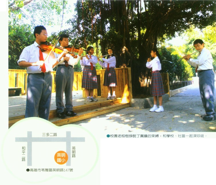 同時在英明國中校園圍牆邊上,還有一株大榕樹,這棵大榕樹在學校和公園之間,幾乎是杵在牆面上,造成圍牆的破損,更無景觀可言。但藉著社區通學道的規劃,學校同意將圍牆向內退縮一隅,利用榕樹周邊的環境,營造出一個緊挨著圍牆的校戶榕樹劇場,也等於解放老榕樹的生命,以建立生態永續的教育觀念。
