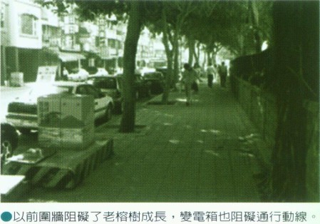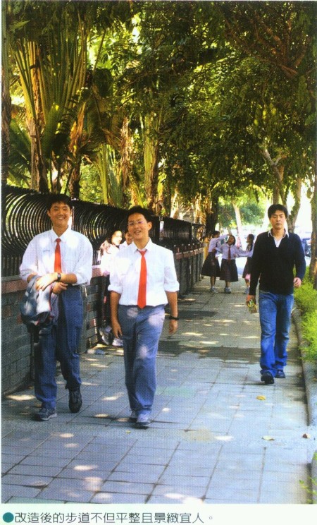 另一方面緊臨學校的社區公園和學校人行道也缺乏銜接的介面與人車轉圜的空間,當地的里長一再要求學校改善校園人行步道的無障礙設施,讓進入公園的民眾,也能取道校園旁的步道,不必擠在馬路上。但長期以來學校也一直爭取不到足夠的經費進行空間的改善,直到市府工務局的「社區通學道」改善計劃出爐,才讓這個問題得到解決的契機。因此無論是對社區和學校而言,英明國中社區通學道帶來的不只是學校意象煥然一新,更務實的改善了當地的交通問題。