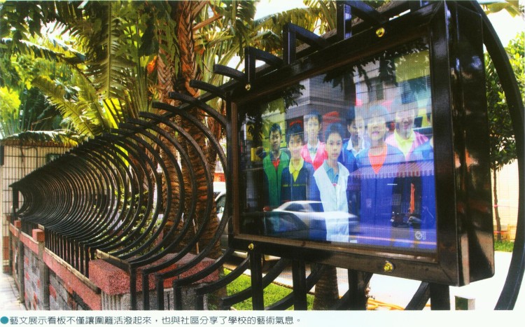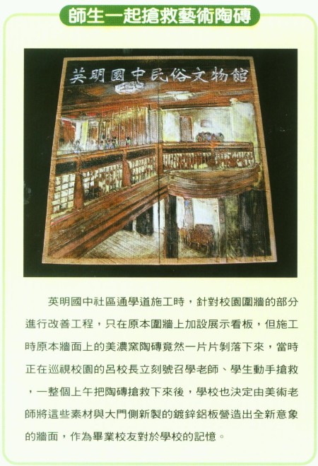 規劃英明國中社區通學道的建築師戴曄指出,學校方面十分重視學生音樂、美術等各方面的表現,校內設有閱讀的飲料吧台與民俗文物館,獲得各界的好評,因此在和校方溝通後,特別把校園圍牆作為教育、文化、藝術的承載平台,讓難得進到學校參觀的社區民眾,也能透由圍牆的意象展示分享校園之美,就好像是學校的文化櫥窗,八個活動燈箱沿著鏤空的圍牆施設,讓原本平面單調的牆面,配合人行道改造而豐富起來。