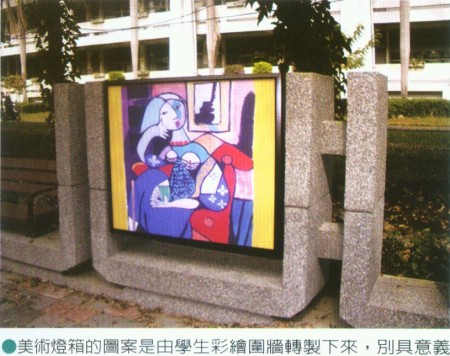 擁有田園耕讀夢想的莊校長一心把學校當作自家庭園在經營,也十分善用校園內被修剪過的樹枝塑造出「枯木逢春」 景緻,因此花卉植栽的配置也就成為後勁國中社區通學道的重點。當原本的圍牆被拆除,改為一個個相串連的花台與等候座椅後,綠蔭、草花以及點綴其間的彩繪燈箱,立即突顯出通學道的田園主題,尤其成排的巨大樟木上還種植著蘭花,在陽光間跳躍出美麗的色彩,莊校長更建議社區建築師在通學道上種植桂花,讓社區通學道就像一條暗香浮動的小徑。