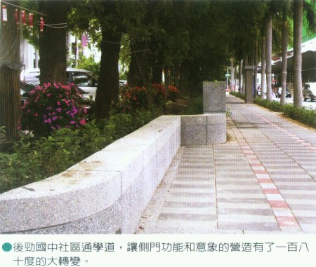 莊校長指出,後勁國中通學道主要連結的是後勁舊部落社區,過去人行步道的連鎖磚早已損破,每年都要修修補補,學校也年年想要爭取社區通學道的改善計畫,直到2006年才如願以償。秉持開放性校園的規劃理念,善用既有資源,以園藝的手法,注入田園的意象來營造社區通學道,就是要讓學校師生、家長、社區民眾走在這條步道上有幸福的感覺。
