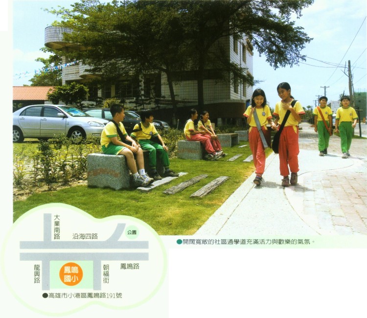 位於小港接近鳳鼻頭地區的鳯鳴國小,全校只有276名學生,卻擁有近2公頃的校園面積,在校長林秀美的經營下,整個校區宛如一座森林小學。一走進學校,迎面而來的是點綴繁花的前庭和綠蔭成林的榕樹步道,校園美景令人目不暇給,也使得鳳鳴國小不但獲得教育部頒發的2005年全國學校經營創新獎,以及接連榮獲高雄市空氣污染防治綠計畫優等等獎項的殊榮,正因為這份的用心,鳳鳴國小社區通學道的規劃,也展現出別出心裁、匠心獨具的美感,同時為鄰近社區的生活品質更添光彩。