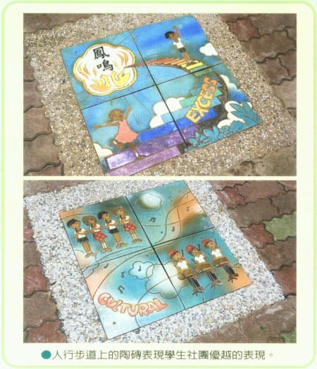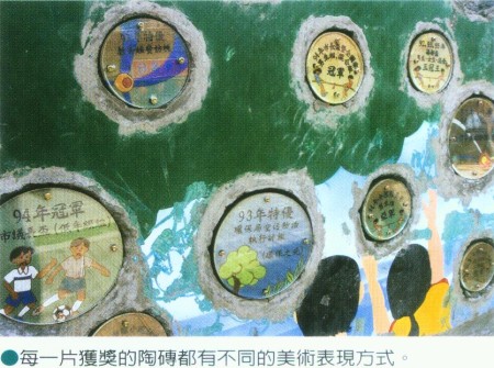 除了舖面設計的變化,鳳鳴國小也利用一堵展示牆和壁畫,嵌入學校曾經榮獲的獎項,每個獎項都以特製的美術圓形陶磚呈現出來。即使獲獎琳瑯滿目,但林校長還是意猶未盡的表示,獲獎太多了,擺不下,只好挑選部分展示!