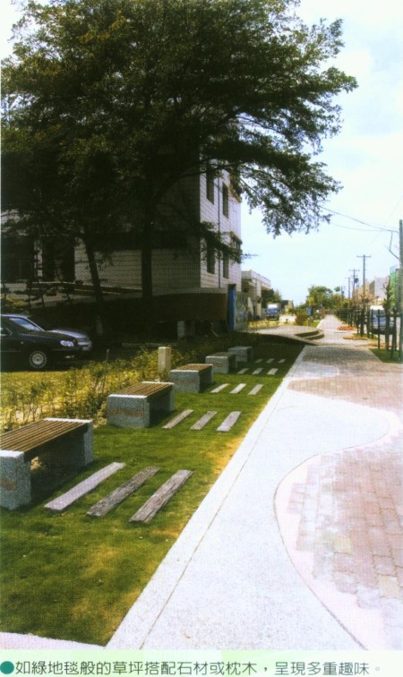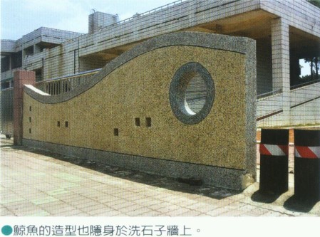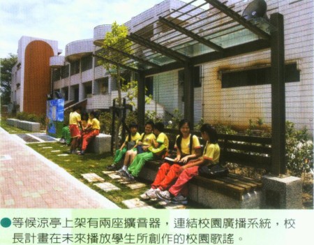 四十年的老舊圍牆被拆除後,沒有規劃阻隔性的花台,而是密植三百多株的桂花做為綠籬,綠籬前則以洗石子的方式配置等候座椅,座椅前和人行步道之間還有一條帶狀的草皮,像綠地毯般延伸出去,讓人充份感受到那份柔軟與閒適。人行步道上還鑲著特別訂製的美術陶片,分別表現學校在人文、體育、音樂等各方面的表現,瑰麗的色彩和略帶拙稚的表現手法令人會心一笑。