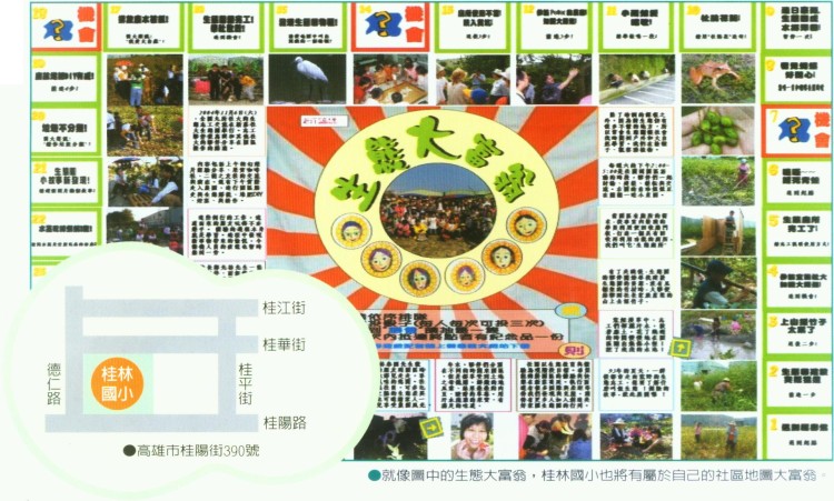 而鋪面上則是有趣的「大富翁」 ,原來是把社區地圖以大富翁的遊戲型式呈現,讓小朋友在不知不覺中對社區有更深入的認識。在這麼有趣的規劃中,全校師生與附近民眾都熱切期盼桂林通學道完成之後,將擁有一條「 抬頭造飛機、腳踏大富翁」的美麗步道。